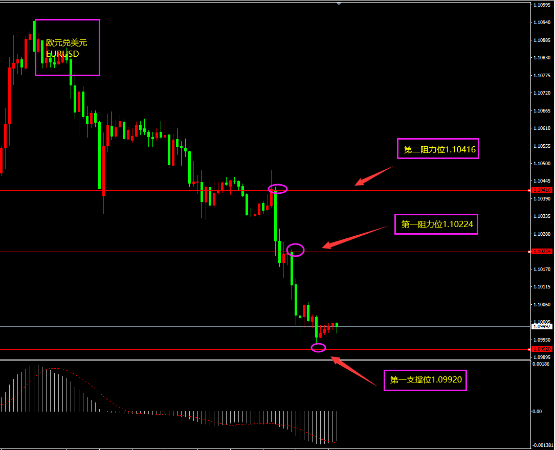 技术点评:天图欧元收大阴线,走势步入震荡低位,近两日美指的强势对欧元形成打压,欧元盘整低位有望反弹,但需等底部出阳线,阳线出则欧元形成新一轮上涨。小时图欧元期间连续阴线下跌,目前1.1位置为强支撑,空头走势放缓,底部有连续阳线产生,MACD也逐渐上移,但需等大阳线,阳线出则多头起。