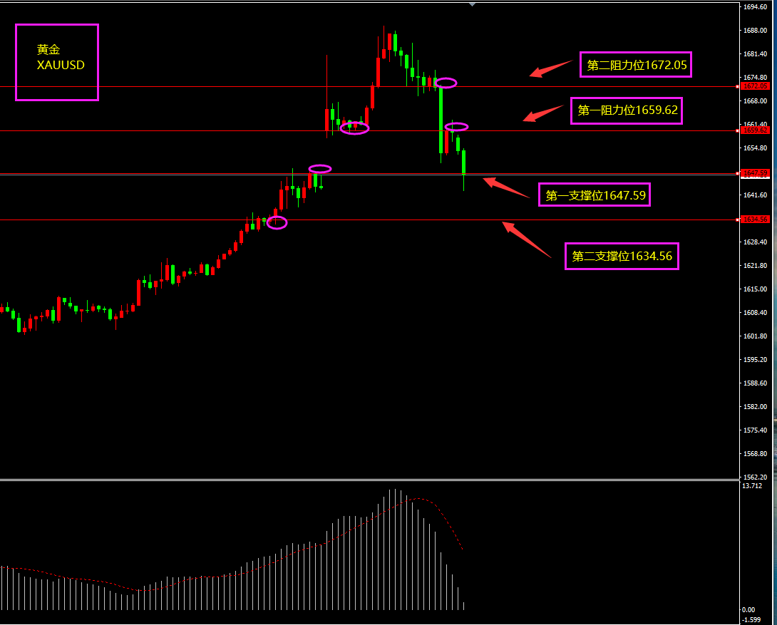 技术点评:天图黄金昨日收十字星,价格曾一度跳空高开高走,但晚间出现大幅回落,上方多头力度不足,投机获利出场,空头逐渐压顶,随着避险的降温,黄金后续以震荡以及震荡下行为主。小时图黄金期间连续阳线拉升,但之后连续阴线回落,MACD能量体大幅走弱,上方空头压顶,日内多头获利了结,价格会将有一波冲高,只要不以大阳线突破1672,后续将出现高位回落。