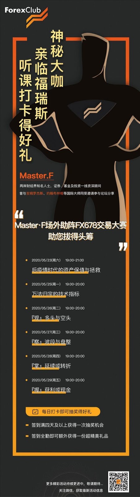 神秘知名分析师Master.F坐镇ForexClub福瑞斯金融,5月23日带你透析『后疫情』时代的资产保值与拯救,精准牢抓机遇!无论新手还是老手,只听这堂课就够了!在疫情金融危机大环境下,如何成功预测市场走向,深刻分析当前乱局,一击得胜!