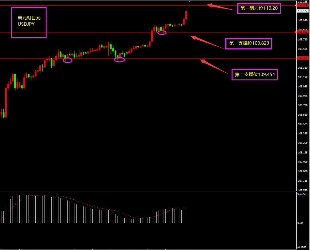 技术点评:天图美日大方向保持看涨,短期以连续大阳线上涨,突破前期整数关口110,近期面临技术回调,关注日内是否形成长上影线。小时图美日价格一路高歌,短期MACD形成顶背离,上方110.20为强阻力位,关注是否有大阳线突破,若期间出现大阴线,则日内将由震荡转为震荡下行。