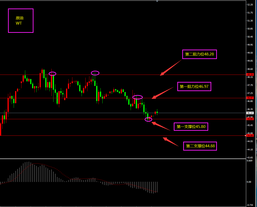 策略分析:第一、二支撑位附近轻仓看多。如有大阴线跌破第二支撑位则转为观望。