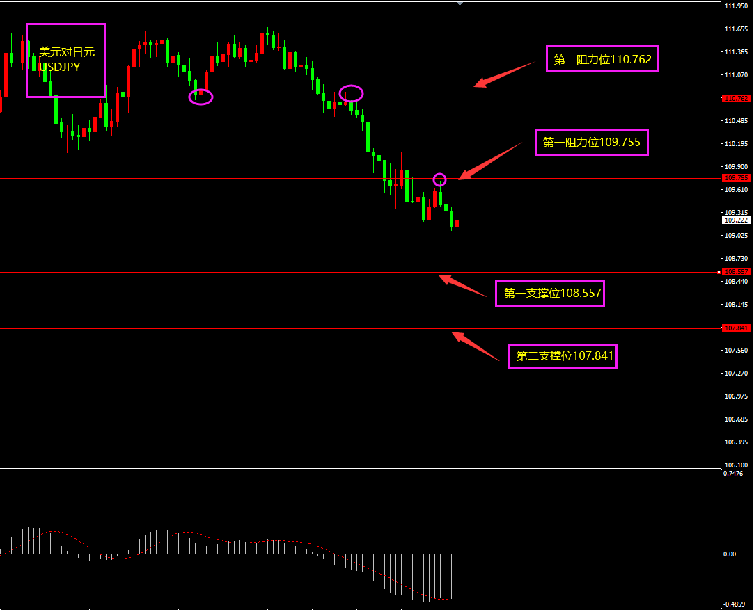 技术点评:天图美日收大阴线,验证上方多头走势放缓,空头逐渐占优,上方为盘整高位,阻力较强,且近期美指大幅下滑,打压美日,日内继续保持着逢高看空为主。小时图美日MACD转移至0轴之下,期间连续阴线跌破高位震荡区域,空头为主,后续美日更多以逢高看空为主。