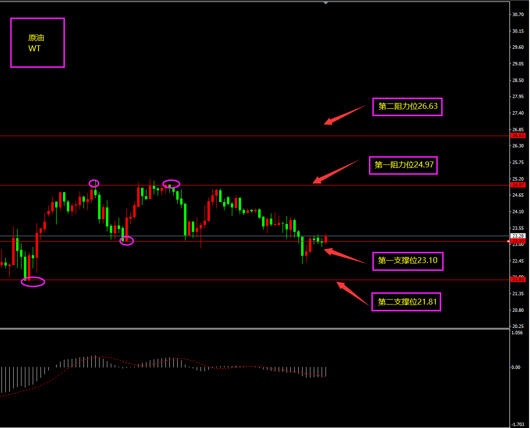 策略分析:第一、二支撑位附近轻仓看多。如有大阴线跌破第二支撑位则转为观望。